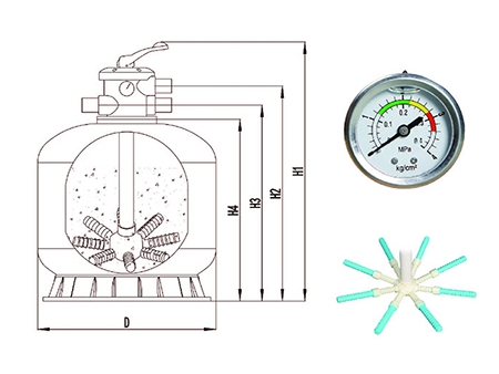| Modelo | Diámetro del tanque | Altura del tanque | Caudal | Área de filtro | Conexiones | Arena necesaria | Empaque | (Peso neto) | (Peso bruto) | |||||||||