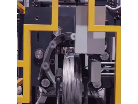 Cuando el alambre alcanza el peso definido, el sistema corta automáticamente, realiza el flejado con flejes de PP o PET y traslada las bobinas a la estación de envoltura. Allí se envuelven pasando el film por el ojo de la bobina, usando cinta tejida, film de PE o papel kraft según su preferencia, después pasan al pesaje, la impresión y aplicación automatizada de etiquetas.