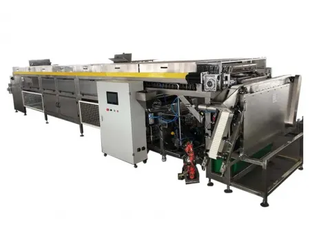 Lleva tus productos bañados en chocolate al siguiente nivel con esta bañadora totalmente automatizada, diseñada específicamente para recubrir bizcochos tipo finger, no tendrás que preocuparte por la manipulación manual ya que la máquina se encarga de todo por ti. Desde la alineación y colocación de los bizcochos hasta su traslado, sujeción, inmersión en chocolate, enfriamiento y retirada final, cada paso está completamente automatizado, garantizando calidad constante y máxima eficiencia.
