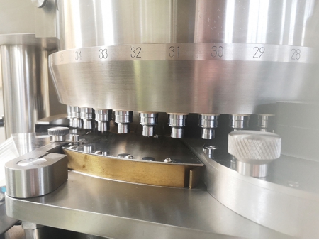 El sistema efectúa el proceso de compresión en dos pasos: precompresión y compresión principal. Posee una estructura compacta, proporciona un tiempo de compresión prolongado y funciona de forma estable y sin deformación bajo cargas pesadas, lo que garantiza el peso exacto y la buena compactación de las tabletas al tiempo que asegura un bajo nivel de ruido.