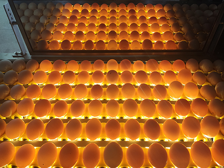 Los huevos se transportan a la sección de observación al transluz. Puede verificar los huevos con fugas, sucios y agrietados a través de la luz LED, reconocerlos y retirarlos manualmente. La clasificadora de huevos 109 también está equipada con una cubierta de observación al transluz de acero inoxidable y un espejo para obtener mejores resultados de observación al transluz.