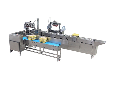 Cada clasificadora de huevos se conecta con empaquetador o envasadora automática. Esta clasificadora de huevos puede equiparse totalmente con 4 empaquetadores o envasadoras automáticas.