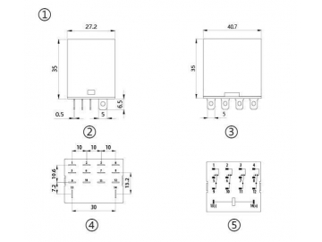 Terminal tipo zócalo① Vista frontal; ② Vista lateral; ③ Tamaño de instalación; ④ Diagrama de cableado