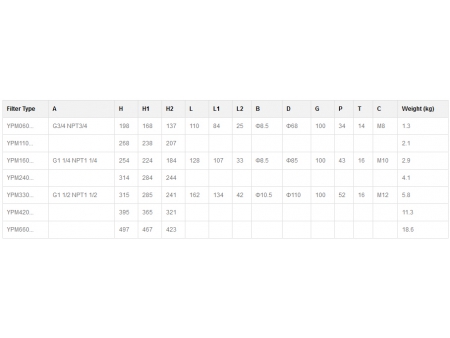 Tipo de filtro A H H1 H2 L L1 L2 B D G P T C Peso (kg)