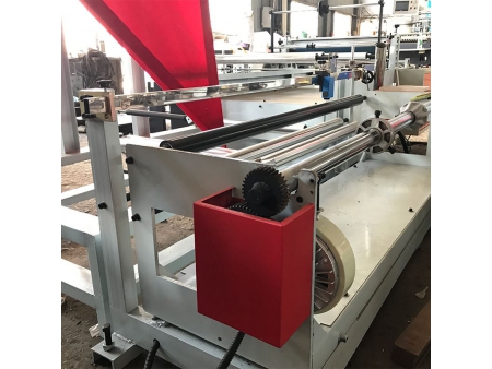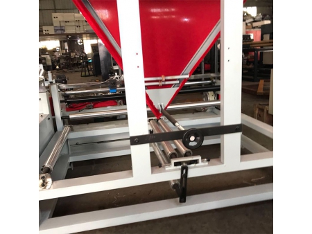Esta plegadora de dobladillo de plástico es parte de un set de máquinas de corte térmico, diseñado para el plegado BOPP y con pegado automático, refuerzo inferior, inserción de película BOPP perlada y sellado longitudinal junto con un generador ultrasónico y rotura de material de rollo (el mecanismo de rotura se encuentra individualmente).