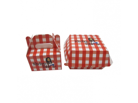 Esta caja se usa para envasar ciertos alimentos como hamburguesas, panes y papas fritas.
