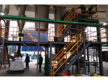 Imágenes de un proyecto de secado de paraformaldehído al vacíoDespués del proceso de condensación en vacío, la concentración del formaldehído se incrementa hasta 80%, y entonces se bombea a la torre de enfriamiento por pulverización. Esta solución concentrada de paraformaldehído se rocía mediante una tobera para ser condensada en una forma sólida granular de paraformaldehído. Este proceso es constante y requiere de poco tiempo: el resultado es un producto de buena solubilidad, debido a la cadena más corta de formaldehído.