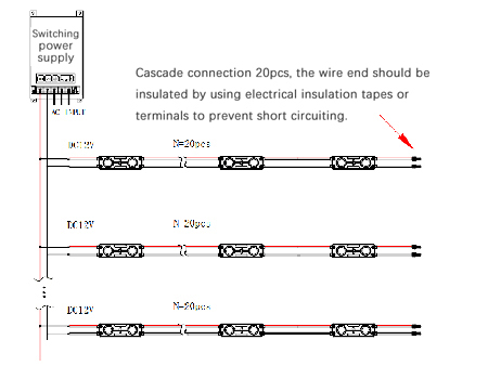 - El cable de alimentación principal posee una medida de 2x1.5mm2. Si las líneas de las tiras LED rígidas se deben alargar, la energía de la lámpara requiere un cable que supera los 0.75mm2 / 18 # y así previene sobrecargas en el cable de alimentación, y en consecuencia se evita un calor excesivo. La fuente de alimentación y la longitud del cable de alimentación no deben superar los 3 metros; en caso de que lo haga, incrementara las pérdidas de la línea.