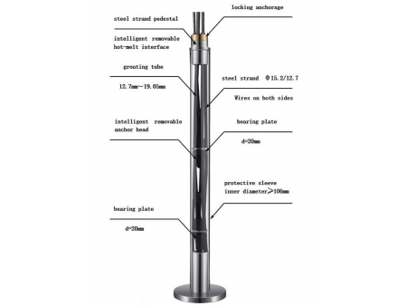 El anclaje de cable desmontable serie RZI combina la medición de la fuerza interna en tiempo real y la función de recuperación. Se utiliza principalmente en fosos de cimentación a gran escala y taludes lo que permite recuperar el anclaje y la medición en tiempo real para garantizar la seguridad. El extensómetro se localiza en la punta de la sección de anclaje que se encuentra envuelta en el relleno. Comparado con el anclaje convencional, este anclaje está equipado con un extensómetro a prueba de agua lo que permite al anclaje inteligente tener mayor duración y poseer una gran precisión en la medición de fuerza. La propiedad de recuperación resuelve efectivamente el problema de excesos de tendón de acero en el suelo. Tradicionalmente, los restos de tendones permanecen en la capa de suelo lo que da por resultado desperdicio de materiales, contaminación del suelo y crea más obstáculos en el suelo lo que incrementa la dificultad en el futuro desarrollo del espacio subterráneo circundante. Asimismo, se deben pagar costos mayores para retirar estos obstáculos. Sin embargo, con el uso de la tecnología de fusión en caliente desmontable, todos los tendones pueden removerse o recuperarse después de que el proyecto de apuntalamiento sea completado.
