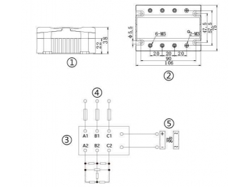 ① Figura con las dimensiones; ② Tamaño de instalación; ③ Diagrama de cableado; ④ Carga de la fuente de alimentación; ⑤ Control de la fuente de alimentación