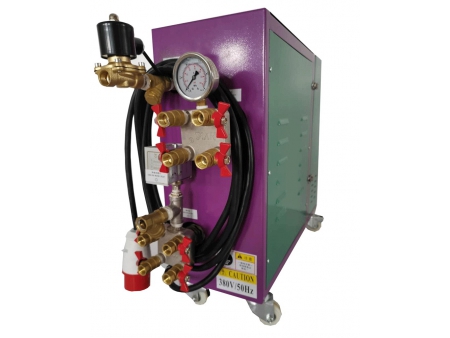 - Este controlador de temperatura de molde combina los dispositivos de calentamiento, refrigeración y dispositivos decirculación del medio de calentamiento, así como el controlador de temperatura en un solo dispositivo con un diseño simplificado y una ocupa una superficie reducida.