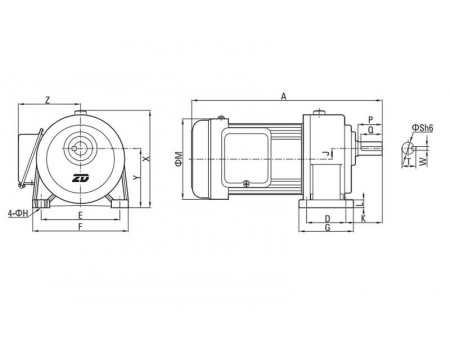| Potencia | Relación de transmisión | A | D | E | F | G | H | J | K | L | M | X | Y | Z | S | P | Q | W | T | Peso |
