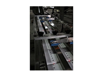 El sistema organizará en dos carriles las galletas que vienen de un transportador, y uno de los carriles de galletas será volcado. A través de la cinta transportadora de vacío, se alineará y apilará dos carriles de galletas antes apilarlas y transportarlas automáticamente a la máquina de envasado.